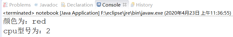 1 public class notebook { 2 3 public static void main(String[] args) { 4 // TODO Auto-generated method stub 5 laptop a = new laptop(); 6 a.color = "red"; 7 a.cpumodel = 2; 8 a.show(); 9 } 10 11 }