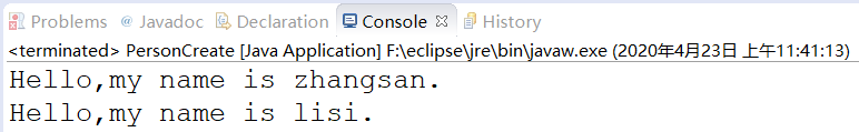 1 public class PersonCreate { 2 3 public static void main(String[] args) { 4 // TODO Auto-generated method stub 5 Person a=new Person(); 6 a.name="zhangsan"; 7 a.high=1.73; 8 a.age=33; 9 10 Person b=new Person(); 11 b.name="lisi"; 12 a.high=1.74; 13 a.age=44; 14 15 a.sayHello(); 16 b.sayHello(); 17 } 18 }