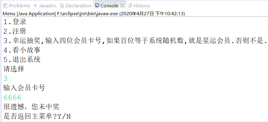 1 package date424; 2 3 import java.util.Scanner; 4 import java.util.Random; 5 6 public class Menu { 7 8 public static void main(String[] args) { 9 mainMenu(); 10 } 11 12 public static void mainMenu() { 13 Scanner input = new Scanner(System.in); 14 System.out.println("1.登录"); 15 System.out.println("2.注册"); 16 System.out.println("3.幸运抽奖,输入四位会员卡号,如果百位等于系统随机数,就是星运会员.否则不是."); 17 System.out.println("4.看小故事"); 18 System.out.println("5.退出系统"); 19 System.out.println("请选择"); 20 int i = input.nextInt(); 21 switch (i) { 22 case 1: 23 login(); 24 break; 25 case 2: 26 zc(); 27 break; 28 case 3: 29 xycj(); 30 break; 31 case 4: 32 kxgs(); 33 break; 34 case 5: 35 tcxt(); 36 break; 37 38 } 39 } 40 41 private static void login() { 42 // TODO Auto-generated method stub 43 Scanner input = new Scanner(System.in); 44 System.out.println("输入用户名"); 45 String uname = input.next(); 46 System.out.println("输入密码"); 47 String upwd = input.next(); 48 if (uname.equals("zs") && upwd.equals("123")) { 49 System.out.println("登录成功"); 50 } else { 51 System.out.println("登录失败"); 52 } 53 returnMain(); 54 55 } 56 57 private static void zc() { 58 // TODO Auto-generated method stub 59 Scanner input = new Scanner(System.in); 60 System.out.println("输入新用户名"); 61 String uname = input.next(); 62 System.out.println("输入新密码"); 63 String upwd = input.next(); 64 if (uname.equals(null) && upwd.equals(null)) { 65 System.out.println("未输入有效信息,注册失败"); 66 } else { 67 System.out.println("注册成功"); 68 } 69 returnMain(); 70 71 } 72 73 private static void xycj() { 74 // TODO Auto-generated method stub 75 Scanner input = new Scanner(System.in); 76 Random r = new Random(); 77 int i = r.nextInt(1); 78 System.out.println("输入会员卡号"); 79 int unumber = input.nextInt(); 80 if (unumber/100%10==i) { 81 System.out.println("恭喜您!您是星运会员"); 82 } else { 83 System.out.println("很遗憾,您未中奖"); 84 } 85 returnMain(); 86 87 } 88 89 private static int inputnext() { 90 // TODO Auto-generated method stub 91 return 0; 92 } 93 94 private static void kxgs() { 95 // TODO Auto-generated method stub 96 Scanner input = new Scanner(System.in); 97 System.out.println("是否要看小故事?Y/N"); 98 String answer = input.next(); 99 if (answer.equals("Y")) { 100 System.out.println("从前有座山,"); 101 System.out.println("山里有个庙,"); 102 System.out.println("庙里有个老和尚给小和尚讲故事,"); 103 System.out.println("故事讲的是:"); 104 System.out.println("从前有座山,"); 105 System.out.println("山里有座庙,"); 106 System.out.println("…………………………"); 107 System.out.println("…………………………"); 108 System.out.println("…………………………"); 109 } else { 110 System.out.println("不看拉倒!"); 111 } 112 returnMain(); 113 114 } 115 116 private static void tcxt() { 117 // TODO Auto-generated method stub 118 Scanner input = new Scanner(System.in); 119 System.out.println("继续退出系统?Y/N"); 120 String answer = input.next(); 121 if (answer.equals("Y")) { 122 System.out.println("谢谢使用"); 123 } else { 124 System.out.println("即将返回主菜单"); 125 } 126 returnMain(); 127 128 } 129 130 public static void returnMain() { 131 System.out.println("是否返回主菜单?Y/N"); 132 Scanner input = new Scanner(System.in); 133 if (input.next().equalsIgnoreCase("Y")) { 134 mainMenu(); 135 } else { 136 System.out.println("谢谢使用"); 137 } 138 139 } 140 141 }