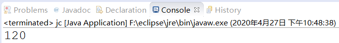 1 package date424; 2 3 4 public class jc { 5 public int jc(int x) { 6 int sum = 1; 7 for (int i = 1; i <= x; i++) { 8 sum *= i; 9 } 10 return sum; 11 } 12 public static void main(String[] args) { 13 jc u=new jc(); 14 System.out.println(+u.jc(5)); 15 } 16 }