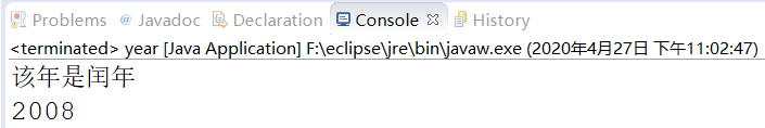 1 package date424; 2 3 public class year { 4 public int year(int x){ 5 if(x%100!=0&&x%4==0||x%400==0){ 6 System.out.println("该年是闰年"); 7 }else{ 8 System.out.println("该年不是闰年"); 9 } 10 return x; 11 } 12 public static void main(String[] args) { 13 year u=new year(); 14 System.out.println(+u.year(2008)); 15 } 16 }