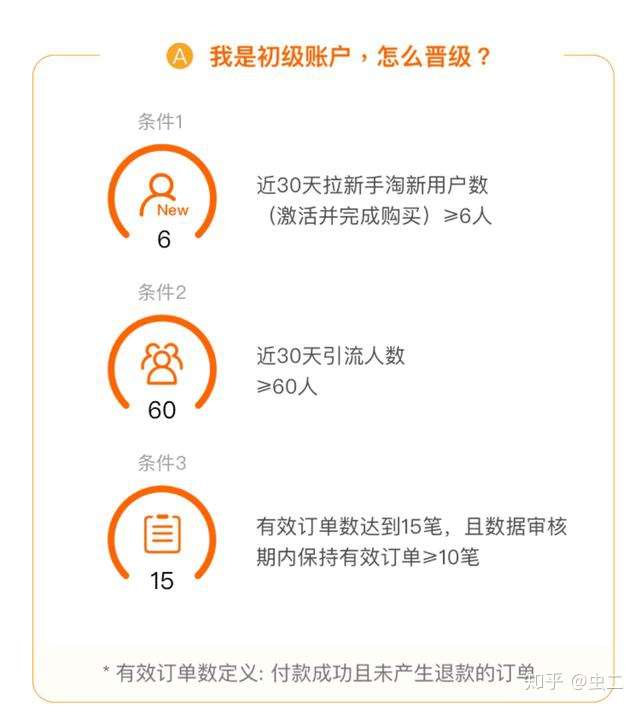 初级账户晋级条件如下。如果你只是自己买买,还需要完成拉新,完成流量,完成订单数才可以。而且每个月都必须完成考核,才能保持高级淘宝客身份,获得高佣金。这个门槛把很多新手拦在了淘宝客推广的门外。