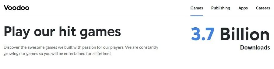2019年一年,Voodoo旗下产品下载量突破10亿,截至目前,Voodoo累积下载量已达37亿,位居全球超休闲游戏发行商下载量第1。