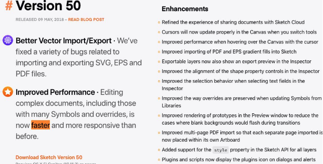 而在这个版本推出的时间,静电记得Sketch的图像渲染引擎也做了调整,推测这跟Apple官方对AMD的支持有关系,到现在为止,渲染引擎一直是更换后的Metal,在这之后Sketch主页也一直宣称,软件性能是Faster than Faster。但是,在更换为metal引擎之后,Sketch用户却从未感受到作图速度有多么顺滑,反而是恶梦的开始。