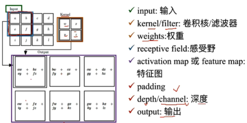 - 二维卷积:y=WX+b;W为卷积核里的参数,X为每次进行卷积的区域,b为偏置项。