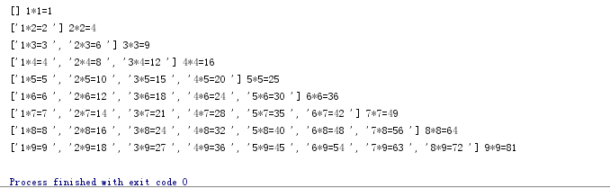for num2 in range(1,10): a=['%s*%s=%s '% (num1,num2,num1*num2)for num1 in range(1,num2)] print(a,'%s*%s=%s '% (num2,num2,num2*num2))