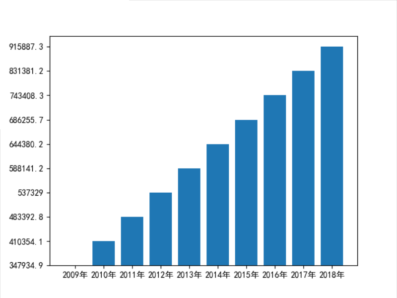 下载09-18年度数据.csv文件,放置.py作业目录,绘制09-18年的 国民总收入 条形图。注意年份顺序。