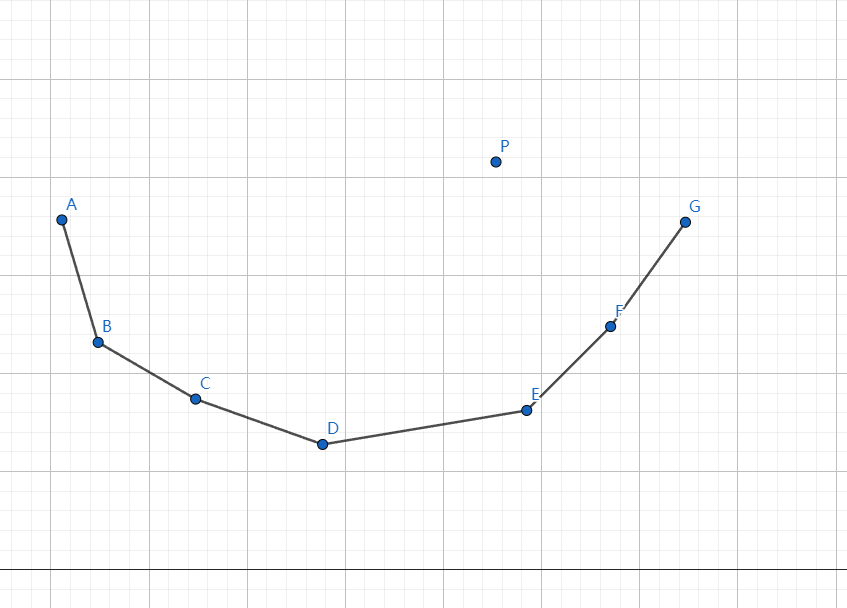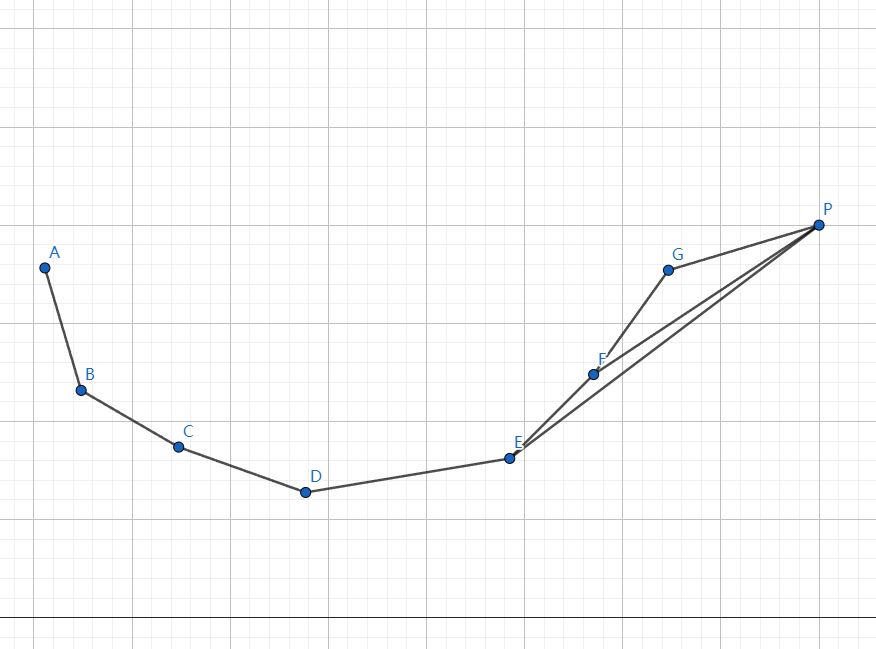 - 如若 \(k_{PG}<k_{FG}\),那么需要一直从队尾出队,直至 \(P\) 与队尾点的斜率不小于上一个点与队尾点的斜率。