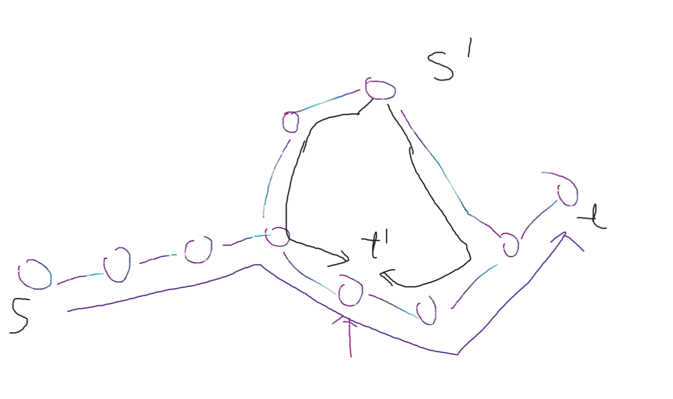 \(s'\to t'\) 有两种不同路径,但是在拓扑 DP 时会错误地判断两条不同路径形成一条链。我们只需对于两个图都跑一遍 DP 后取结果最小值即可。