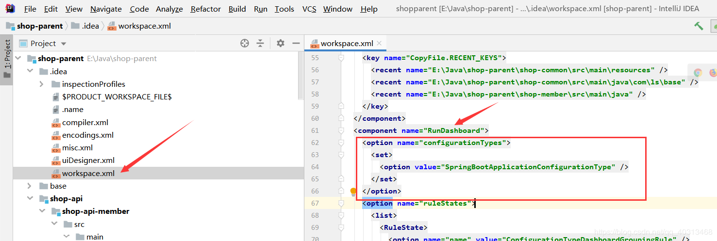 当项目中有多个微服务需要启动时,常规的启动方式需要一个一个启动,在有多个微服务的情况下,这种启动方式非常繁琐,网上提供了在 IDEA 配置文件(workspace.xml)的 RunDashboard 组件下添加配置的方式来批量启动微服务(如图)