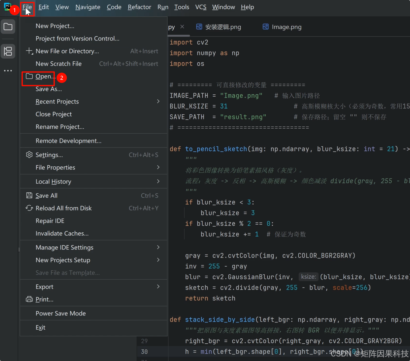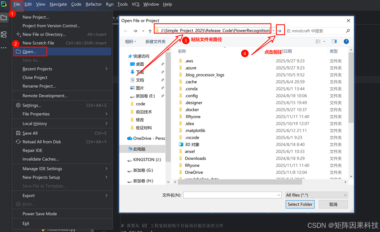 - 启动 PyCharm,依次进入【File → Open】打开文件夹(尚未安装 PyCharm 的同学,可参考这篇文档:https://topai.blog.csdn.net/article/details/154939526)。