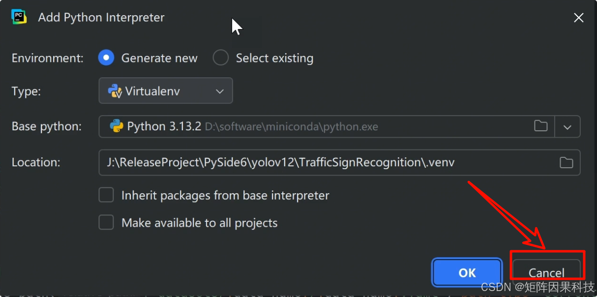 - 若弹出 “Add Python Interpreter” 小窗(PyCharm 提供的新建解释器向导),此时不要创建,直接点 【Cancel】 关闭即可。