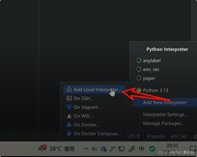 - 在窗口下方的【Interpreter】下拉框,选择刚创建的环境(如