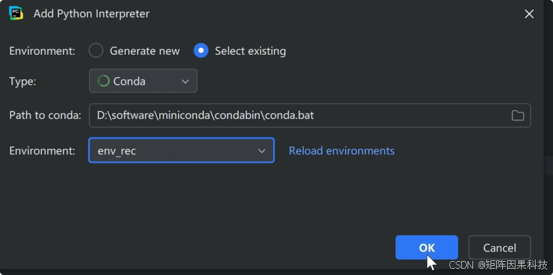 到这里,Conda 侧的环境准备工作完成,下面在 PyCharm 里把解释器指向这个环境。