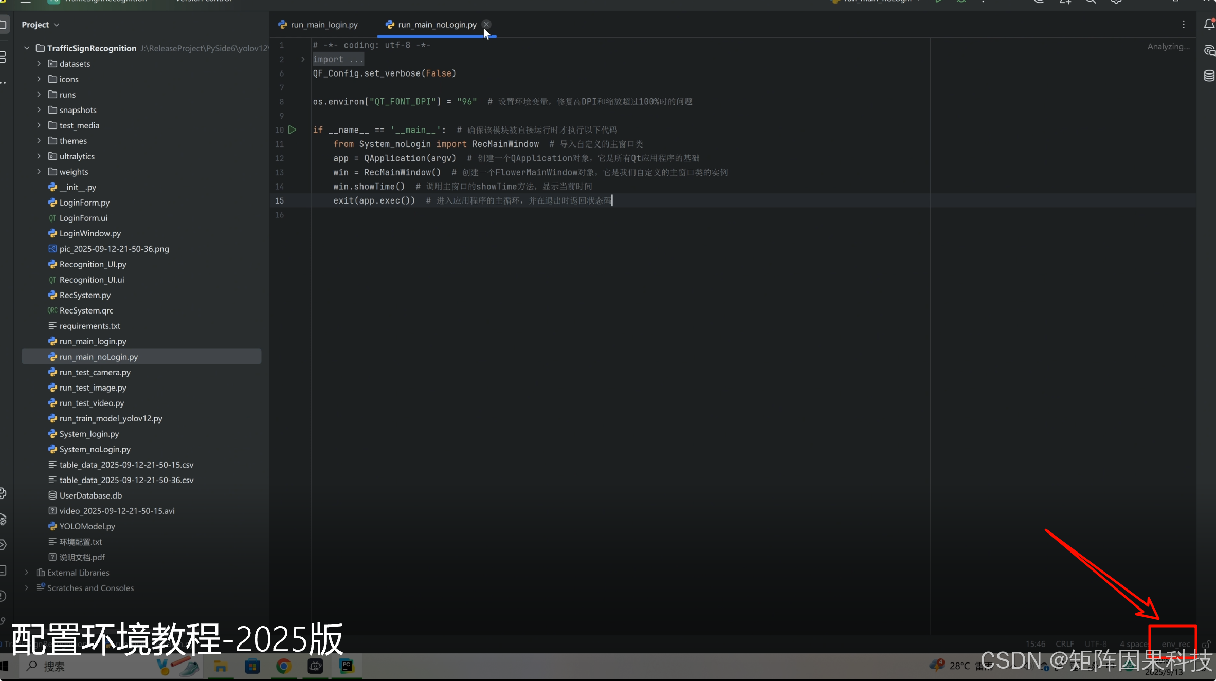 - 观察 PyCharm 右下角的解释器状态区域(可能显示为