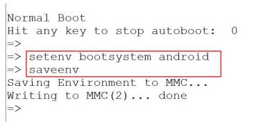 设置系统参数:在 uboot 的命令行中,使用命令“setenv bootsystem android”设置环境变量参数为“Android”启动模式,然后使用“saveenv”保存,如下图。
