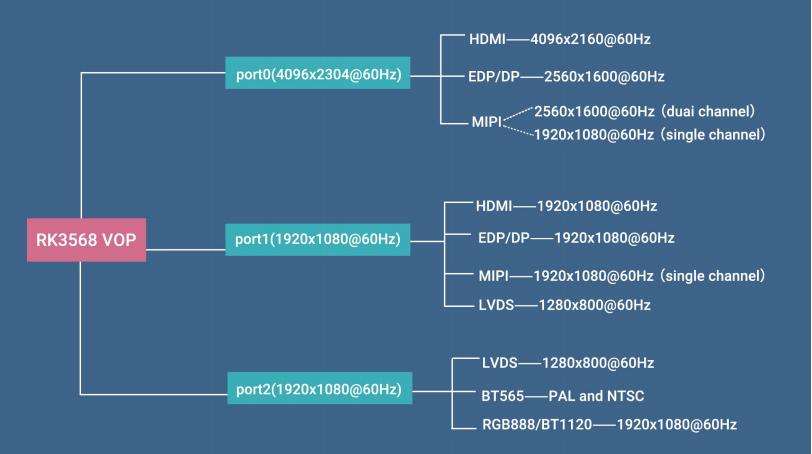 iTOP-3568 支持三屏幕显示,这主要取决于 RK3568 芯片内置了 VOP 控制器,支持三路视频同时输出,其框图如下所示: