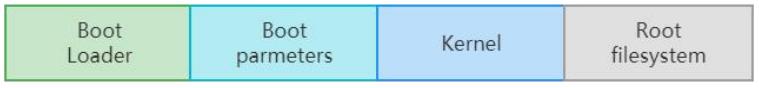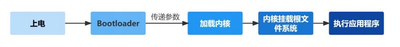 在系统正常启动过程中,Bootloader 首先运行,然后将内核复制到内存中(或者在固态存储设备上直接运行,但是效率较低),并在内存某个固定的地址(包括地址与参数的结构) 设置好要传递给内核的参数,最后运行内核。内核启动后,挂载(mount)根文件系统(Root filesystem),启动文件系统中的应用程序。如下图所示: