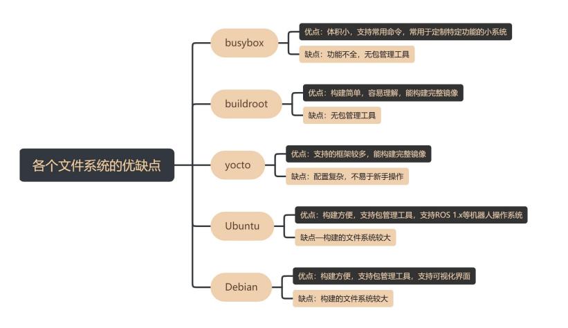 根文件系统本质都是一些文件和配置信息组成,之间的界限没有很明确的界定。最简单的 根文件系统是使用 busybox 工具制作的文件系统。除此之外,还有使用 buildroot 工具和 yocto 工具构建的文件系统。还有发行版 Linux 系统——Ubuntu 系统,Debian 系统。以下大致列出 一些根文件系统的特点,如下图所示: