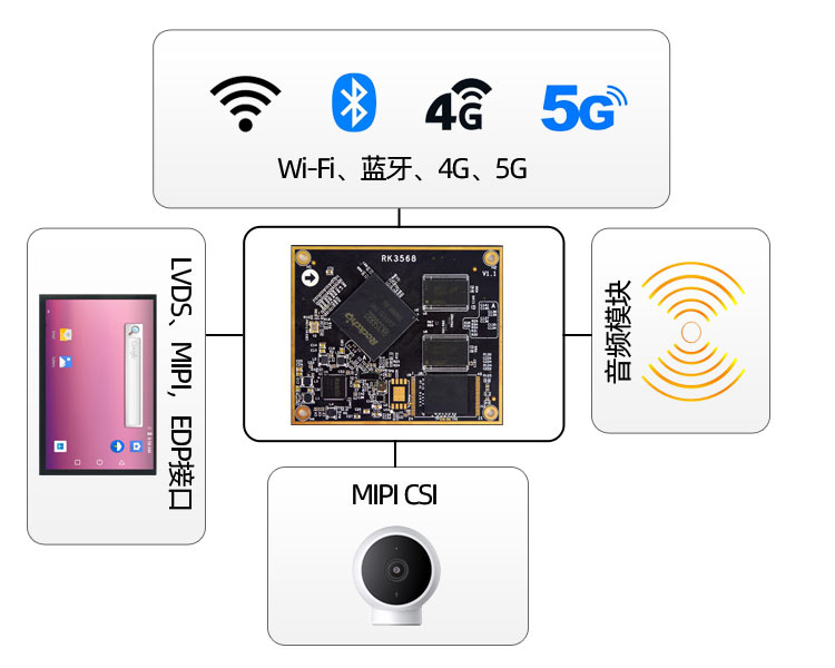 针对人脸识别终端产品,可以采用RK3568处理器搭配摄像头模组、LCD显示屏、声音模组等组成系统。具体方案如下: