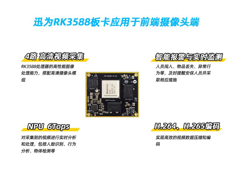 综上所述,RK3588处理器在安防前后端应用中可以实现高清视频采集、实时图像处理、智能报警、大规模视频处理等功能,提升安防系统的效率和可靠性。