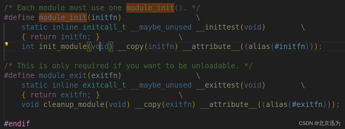 上述代码是用于定义模块的初始化函数和清理函数的宏定义。通过使用module_init宏和module_exit宏,开发人员可以指定模块的入口函数和清理函数。这些宏定义了一些内联函数和与之关联的特殊命名的函数,以及一些属性和别名,用于在编译时进行检查并将用户定义的函数与特定的模块函数关联起来。