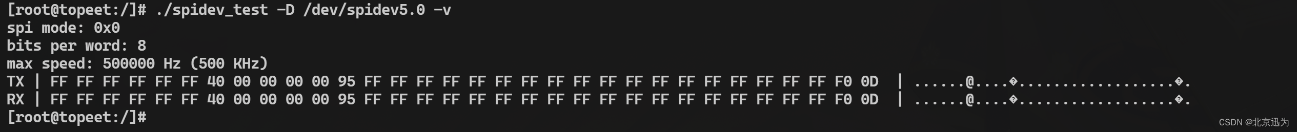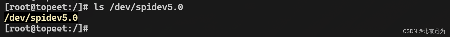 首先要确保烧写的是上一小节编译出来的内核,烧写完成开发板启动之后,使用“ls /dev/spidev5.0”查看是否存在spidev5.0节点,如下图所示:
