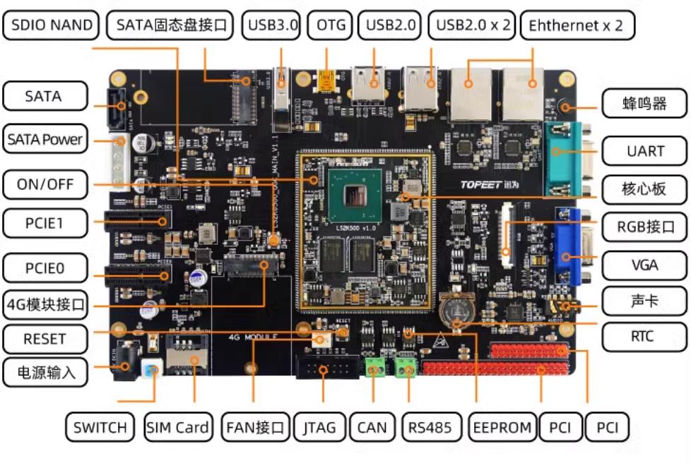 LS2K0500 采用龙芯 2K0500 处理器,基于龙芯自主指令系统 (LoongArch) 架构,片内集成 64 位 LA264 处理器核。实现 ACPI、DVFS/DPM 动态电源功耗管理等低功耗技术,支持多种电源级别和唤醒方式,可根据具体应用场景对芯片部分功能和高速接口进行动态时钟、电源开关控制,满足工控、网络安全等应用领域低功耗应用需求。其目标是为工控 互联网应用、打印终端、BMC 等提供多种解决方案。龙芯 2K0500 采用 40nm 工艺实现,典型 主频 500MHz。