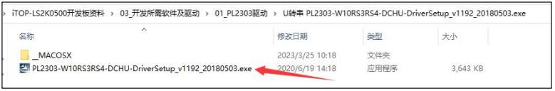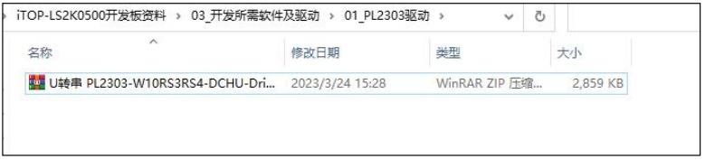 PL2303 驱动软件在“ iTOP-LS2K0500 开发板资料\03_开发所需软件及驱动\01_PL2303 驱动” 目录下,如下图所示: