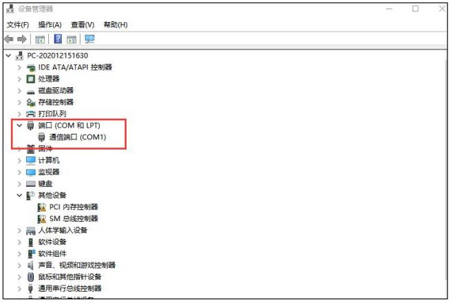 7)用户先不要把‘USB 转串口线’和 PC 机相连,直接进入 Win10-64 位操作系统的设备管理器,如下图所示,打开“端口”。如下图,红色矩形框中显示机器只有一个串口 COM1, 作者的机器自带串口,所以有 COM1。