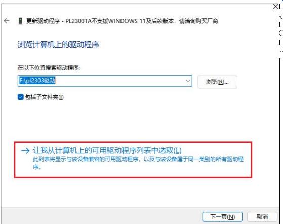 然后我们点击浏览,进入到我们之前解压的 pl2303 的 win11 驱动路径,