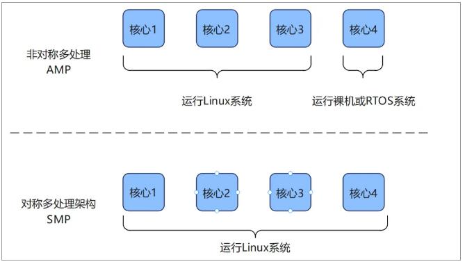 在一般情况下,iTOP-RK3568 的四个 Cortex-A55 核心通常运行 Linux 系统,这种架构称为对称多处理(SMP)。而 AMP(非对称多处理)是一种更灵活的架构,允许不同的核心运行不同的操作系统,实现更高效的资源利用和任务分配。通过 AMP,系统可以为不同的任务选择最合适的操作系统和处理方式。