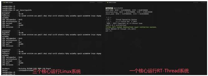 烧写支持RT-Thread的AMP系统后,通过串口终端可以看到Linux系统和RT-Thread系统已经同时运行了,其中CPU0、CPU1、CPU2运行Linux系统,CPU3运行RT-Thread系统,如下图所示: