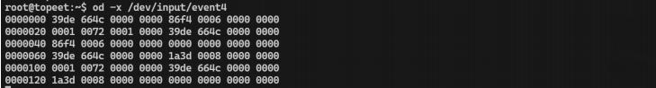从上图可以看到用户按键的事件号是 event4,然后在串口终端输入“od -x /dev/input/event4”