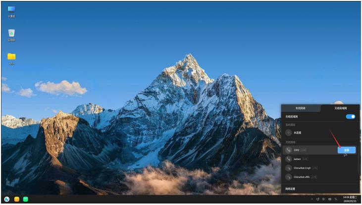 银河麒麟系统桌面启动后点击右下角的网络图标,然后点击无线局域网,