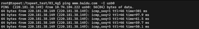 ./quectel-CM &输入命令“ifconfig”会有 usb0 出现,然后输入以下命令,ping 一下百度的 ip,可以看到已经能上网了,如下图所示: