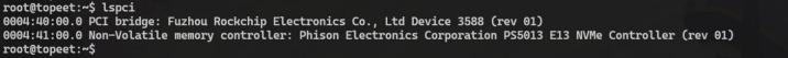iTOP-3588 开发板支持 M.2 接口的固态硬盘,这里以爱国者固态硬盘 P2000 为例,启动前将固态硬盘插入 M.2 接口(在开发板的背面),pci 是一种总线,而通过 pci 总线连接的设备就是 pci 设备。PC 上常用的设备很多都是采用 pci 总线,如:网卡、存储等。输入以下命令显示所有的 pci 设备信息。