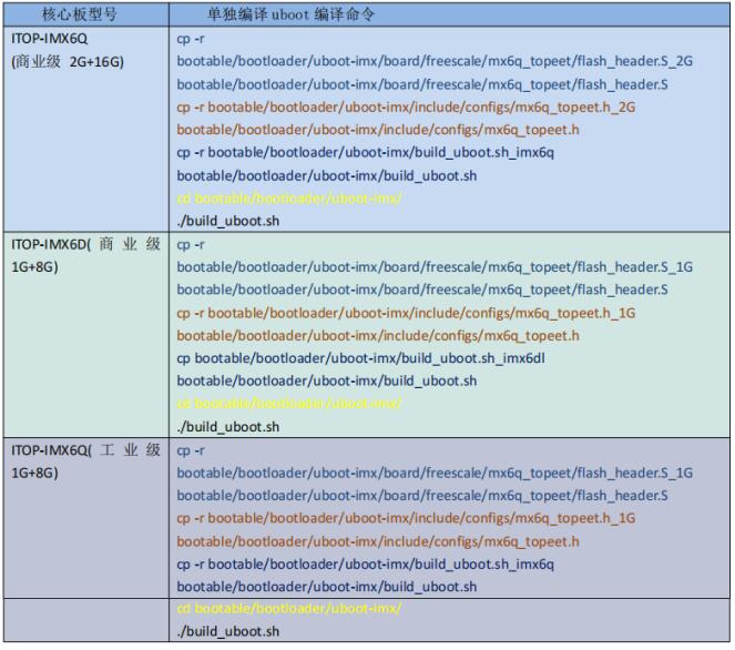2 请大家工具自己手里的核心板型号,输入编译命令,如下表所示,一种颜色的代码代表一条命令: