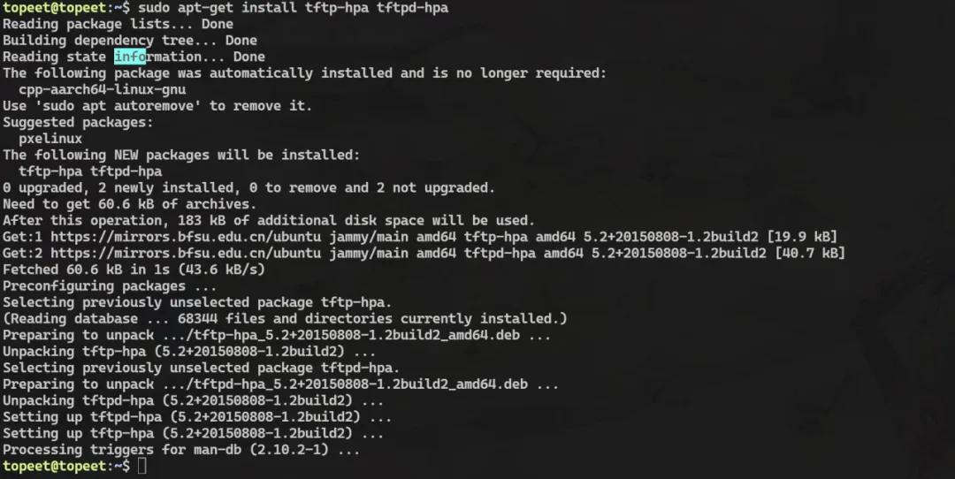 首先进行TFTP 服务端的搭建,首先在ubuntu终端中执行以下命令安装TFTP服务:
