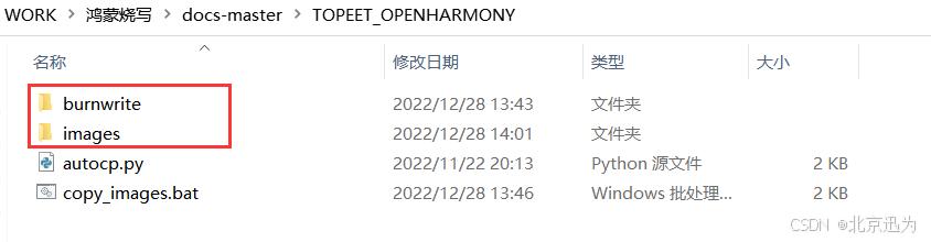 首先拷贝烧写器TOPEET_OPENHARMONY.zip(烧写器在光盘资料“iTOP-3568开发板\01_【iTOP-RK3568开发板】基础资料\02_iTOP-RK3568开发板烧写工具及驱动\TOPEET_OPENHARMONY.zip”)的压缩包到 windows 的任意路径,然后解压压缩包会得到 TOPEET_OPENHARMONY文件夹,进入此文件夹,如下图所示,images下面放置鸿蒙的镜像文件,burnwrite\windows目录下存放烧写器。