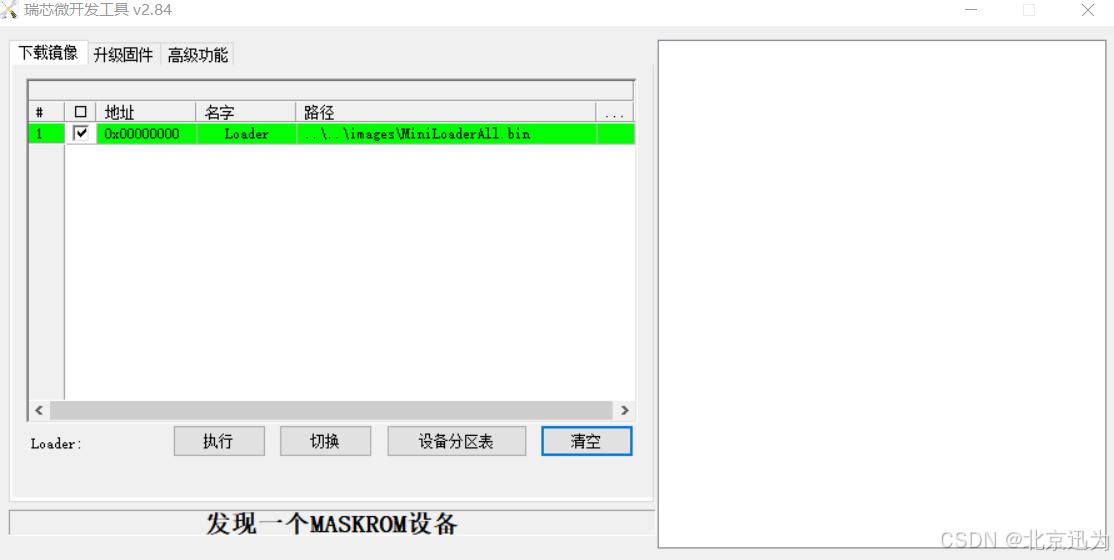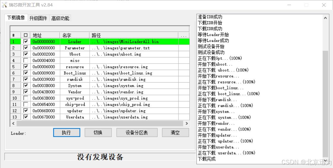 如果您的烧写工具没有发现设备,可以关闭烧写工具,再重新打开一遍烧写工具,然后重复上面的上电步骤。