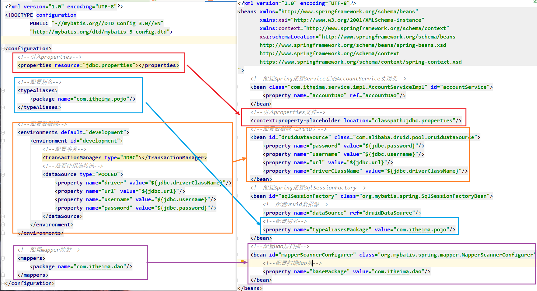 简而言之让Spring接管Mybatis框架,有两种方法,一种保留Mybatis的核心配置文件,另一种将其整合进Spring的核心配置文件,当然是后者更为简单。