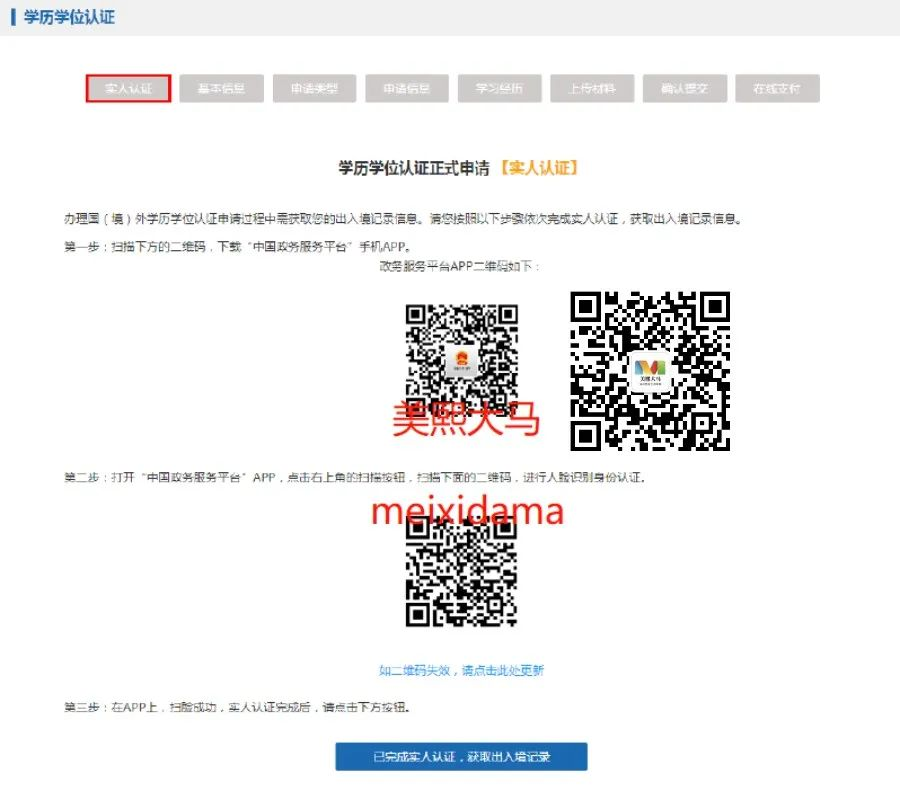 注意:如果无法完成实人认证(比如二维码无法显示或中国政务平台扫脸不成功),可点击下方【跳过实人认证程序,自行上传出入境记录】按钮,跳过此步骤,在上传材料页面自行上传在外学习期间的护照/通行证上的出入境记录页。