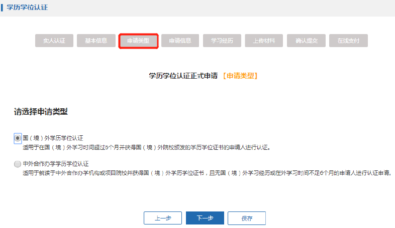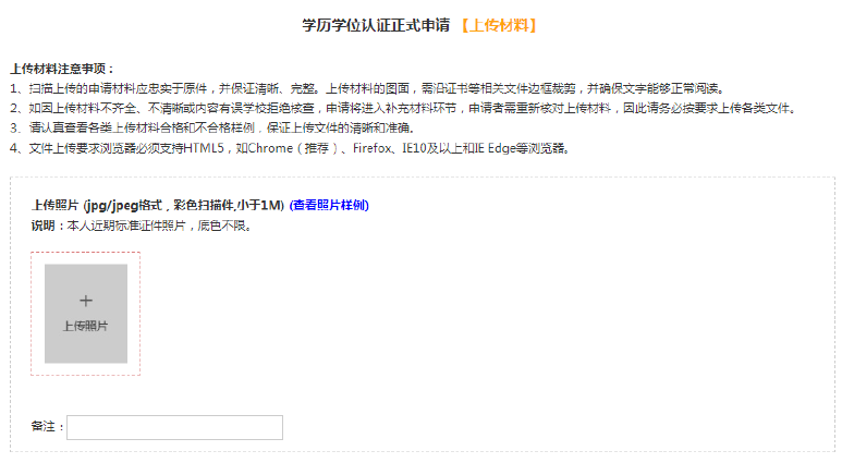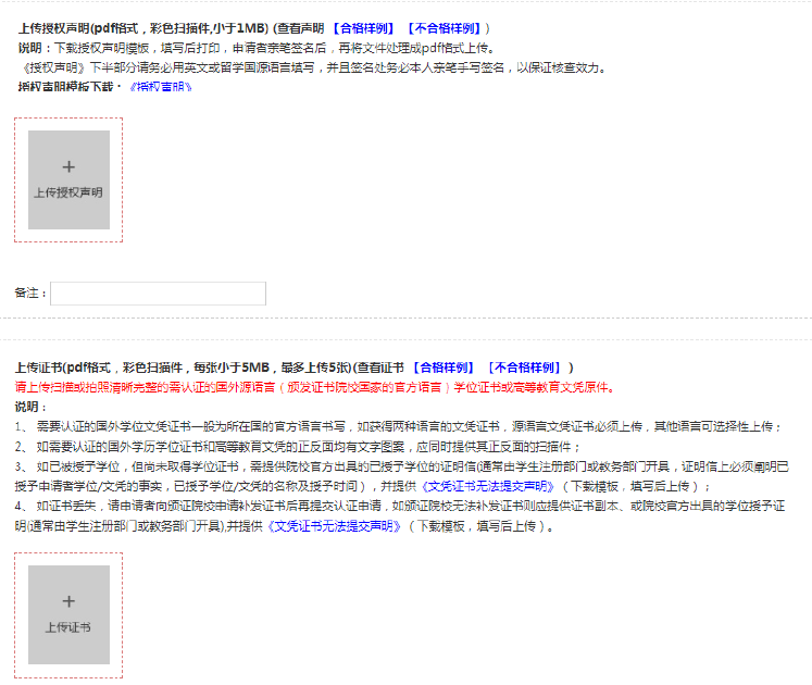 注:一份认证申请只能进行一个学历学位的认证,如果申请人持有多个学历学位需要认证,请分别填写认证申请信息,并请确保您填写的认证申请信息与上传的认证材料一致。