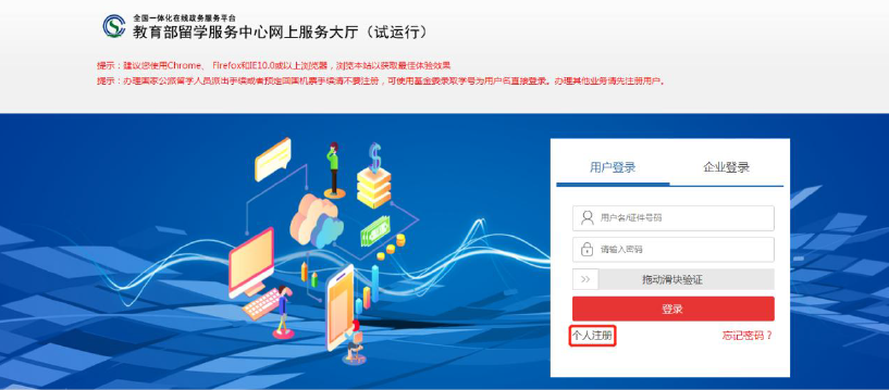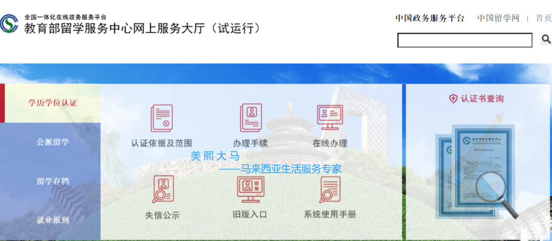 登录留学政务服务平台http://zwfw.cscse.edu.cn/(以下简称“系统”)首页,点击页面上方学历学位认证,选择【在线办理】
