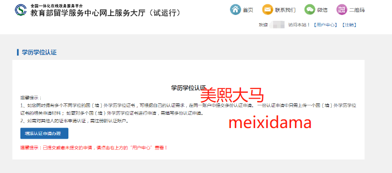 申请人登录系统后,在首页点击“增添认证申请办理”,可添加本人其他国(境)外学历学位证书的认证申请。