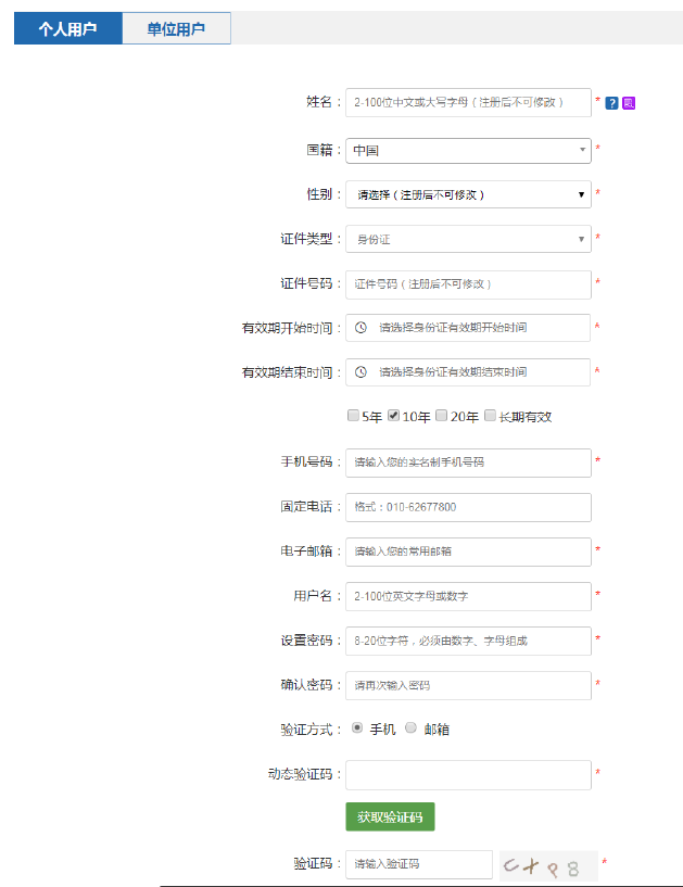 注册时,申请人需填写真实姓名、国籍、性别、证件类型、证件号码、证件有效期开始时间、有效期结束时间、手机号码、电子邮箱。