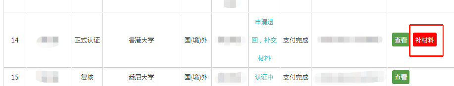 在认证过程中,会出现需要您补交相关材料的情况,您的手机与邮箱会收到相应通知。操作方式:登录系统后,点击首页右上角【用户中心】,可以在“我的申请”中查看到正在认证中的申请,其中,需要补材料的认证申请认证状态会变为“申请退回,补交材料”,操作中会出现“补材料”的按钮。补材料的方式一共有三种:额外添加、重新上传、补线下材料。