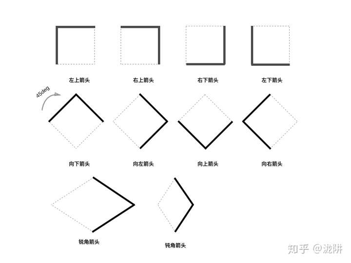 利用边框加上旋转,我们设置两个相邻的边框,然后做 45 度的旋转,这样就可以得到不同类型的箭头了: