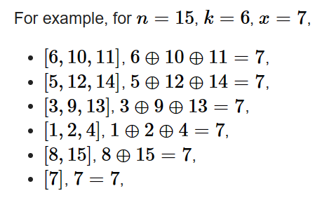 if((i^x)>i &&(i^x)<=n && ans.size()!=k-1){